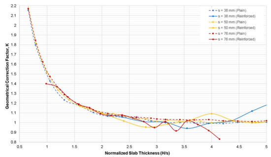 Variation of geometrical correction factor, K, obtained from the numerical simulation case 1 for the reinforced concrete slab model with respect to the normalized slab thickness (H/s).