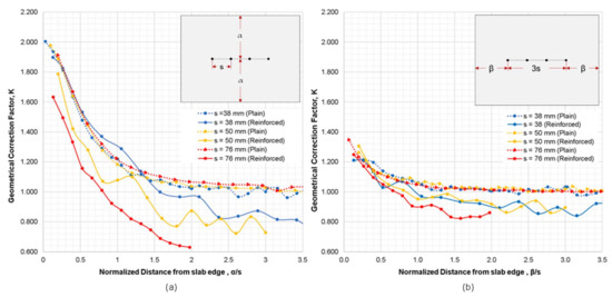 Variation of geometrical correction factor, K, obtained from the numerical simulation cases 2 and 3 for the reinforced concrete models with respect to the normalized distance from slab edge where (a) probes are parallel to edge of slab, and (b) probes are perpendicular to the slab edge.