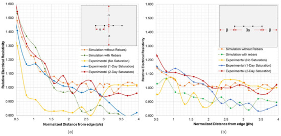 Numerical and experimental relative electrical resistivity of concrete slab with respect to the normalized distance from edge of slab, where (a) probes are parallel to edge of slab, and (b) probes are perpendicular to slab edge.