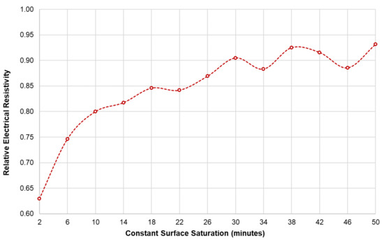 One interesting finding in this study is that concrete in the wet condition decreased the disruptions caused by the presence of steel reinforcement. As discussed, Figure 9a,b show that for one-day and two-day partial saturation of concrete, ER measurements done at a distance of less than twice the electrode spacing from the edge of the slab (α and β < 2 s), the geometrical configuration of slab governs more than the degree of saturation and rebar presence in the variation of relative ER, whereas for α and β > 2 s, relative ER measurements was affected mostly by the rebar presence and the concrete’s saturation condition. Figure 11 shows the trend of the degree of saturation of a concrete specimen with respect to instantaneous surface saturation. With this and Figure 10 as references, the variance percentage of the relative ER can be estimated at different saturation degrees. If this is to be applied in field inspection for instance, the inspectors/engineers have to saturate the surface of concrete slabs (e.g., pavements and bridge decks) for approximately 20 min, to minimize the relative ER to 15% (with a degree of saturation of 0.28). Moreover, for 50 min immersion of concrete, a seven percent decrease is observed. Still, considering both the degree of saturation and presence of steel reinforcement in ER measurement is complicated and needs further study.