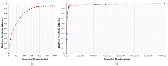 Relationship of the surface saturation of concrete with respect to the relative ER measured directly above the rebar with saturation time of (a) up to 600 min (b) 14,400 min (10 days).