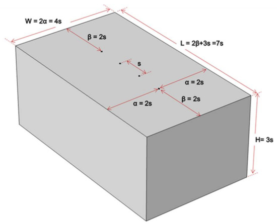 The findings of the experimental investigation and numerical simulation of reinforced concrete slab confirmed that the ER probe should be located far enough away from the bottom and the edges of concrete elements to reduce the geometrical constraint effect on ER measurements, consistent with the recommendations of existing studies [12,43]. The analytical and experimental study provide evidence that the numerical simulation of plain concrete can be a good reference for geometrical correction factor recommendations. As a rule of thumb, it is recommended that the ER measurements be measured on a concrete slab with a thickness greater than at least three times electrode spacing (H ≥ 3 × s), and the ER probe be located far away at least two times electrode spacing from the slab edges (α/s and β/s ≥ 2.0). A schematic diagram, as inspired by the paper of Gowers and Millard (1999) [43], is illustrated in Figure 12, indicating the recommendations for the minimum dimensions of a concrete slab to have the minimum geometrical correction factor (K ≈ 1.0). For a commercially available Wenner probe device with an electrode spacing, s = 38 mm, the minimum value for both α and β is 76 mm. This also means that the minimum dimensions (L × W × H) for a concrete slab is 266 mm × 152 mm × 114 mm. This slab dimensions when simulated in COMSOL generates a geometrical correction factor of 1.0032, validating the recommendation of this study.