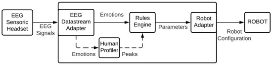The concept of continuously adapting the robot’s parameters to human emotions requires real-time data analysis. This means the system needs to receive the data stream from the headset and provide the needed analysis with minimum latency. As depicted in Figure 2, the approach considers a rule-based model for adapting the robot parameters. The advantage of such approach includes the simplicity of programming the rule or using rule-based reasoning engine for the robot adaptation. On the contrary, fine tuning of the system requires revision of all rules which might requires extra effort.