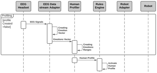 The profiling process is needed for understanding the reaction of each user where the intensity of the emotion can be accurately measured. The human profiling sequence is depicted in Figure 3. As shown in the figure, the sequence starts by reading the electrodes EEG signals. This signal is received by the EEG Datastream Adapter. This adapter will create the emotions vector. This vector will be created in a periodic manner based on the EEG signals and the extracted emotions. For instance, some emotion requires analysis of EEG signals for a certain period like the relaxation and the long-term excitement. Afterwards, the emotions vector is passed to the human profiler where the calculation of the emotions ranges is conducted. This process includes exposing the possible users to the similar stimulus, then recording the reaction of every user to determine the peaks in the emotions. The stimulus may include several clips of videos, several pieces of music or actual and virtual experiment. Finally, the ranges of the extracted emotions for each user can be stored by the Rules Engine for adapting the robot parameters during the operational mode.