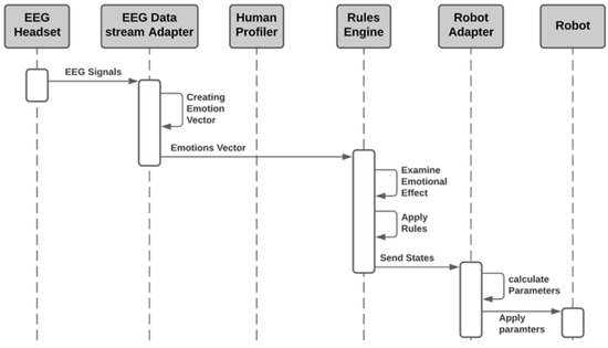 Once the profiling process is finished, the system can be put in the operational mode. The sequence of the operational mode starts by receiving the EEG signals in the EEG Data Stream Adapter as depicted in Figure 4. Like the human profiling mode, the operational mode includes converting the EEG signals to emotions vector. This vector is fed to the Rules Engines. The Rules Engine is configured with predefined first order rules and calibrated to human reactions. This allows the Rules Engine to provide the accurate assessment that the robot is required to perform to adapt to the human emotions. Finally, the Robot Adapter communicate with the robot for reconfiguring the robot’s parameters according to the human’s emotions and feelings.