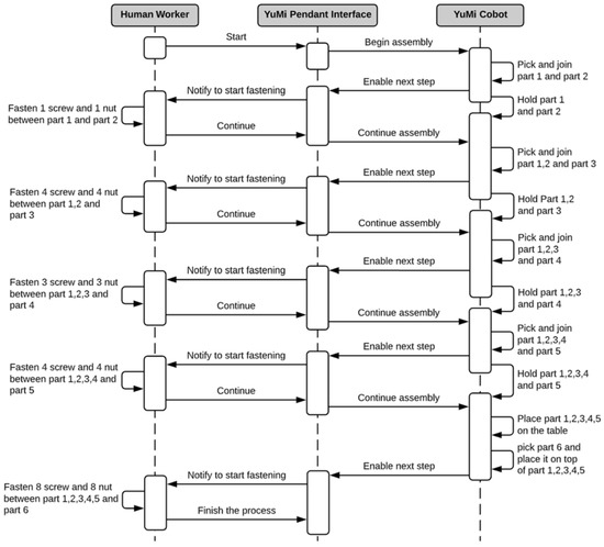 The assembly process is depicted in Figure 8 as a sequence diagram. The process initially involves the human work, the cobot and the interface pendant for the communication. The sequence starts with human worker triggers the robot to pick the 1st and the 2nd faces and hold them together. Once done, the robot will notify the user to start the fastening process. The user then starts the fastening task while the robot is holding the parts. These two tasks are executed in parallel.