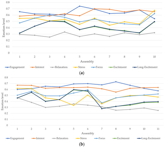 As described in Section 3.2, the human profiling process requires collecting data for the user with different stimulus for estimating the range of emotions during the operational mode. In this regard, and for this research, the EmotivPro software was used for extracting the emotions of the user as metrics. These metrics are scaled particularly for each user on a 0% to 100% scale. Meaning that for the same stimulus, depending on the personal characteristics of an individual, two users could register different values for the same metric. Additionally, due to the software’s algorithms, the more times the headset is used it will generate more data, and in return, the metrics will be more precise. To leverage from this aspect, the training and experiments have been performed on one user incrementing the data and developing a more accurate emotional profile. Thus, three tests have been conducted for the data collection. These tests include valence-arousal test, box assembly alone test and box assembly with Yumi test.