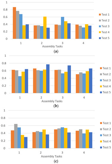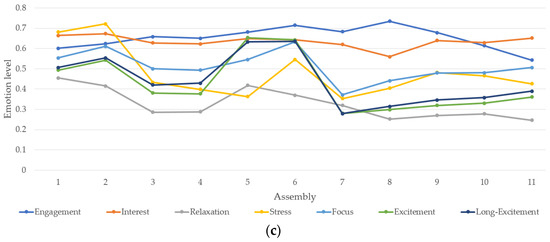 Emotion’s level of the human worker during the 5 tests: (a) stress level; (b) engagement level; (c) focus level.