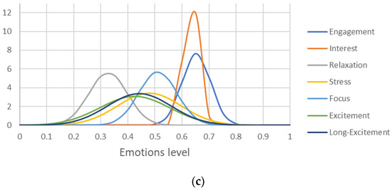 Furthermore, and in order to ease the analysis of the data, normal distributions have been created for each test for the emotions as depicted in Figure 10. Following the figures, it is important to mention that, for these experiments, Excitement and Long-excitement metrics seems to have a close correlation with each other. Moreover, Stress also reflects the relaxation state of the user. In other words, being less relaxed translates to being more stressed and vice-versa. Consequently, Excitement and Interest have a lower relevance in this situation. In addition, the stress emotion reflected the most variance when changing the tests conditions. moreover, interest and engagement show a noticeable correlation. As a conclusion based on the collected data, the most relevant metrics to be evaluated for this application are the Stress, which showed noticeable changes in the mean values and variance; Engagement and Focus emotions of the human worker which both showed independence form Stress and each other. Finally, Table 2 presents the mean and standard deviation of the normal distributions of the stress, engagement focus emotions.