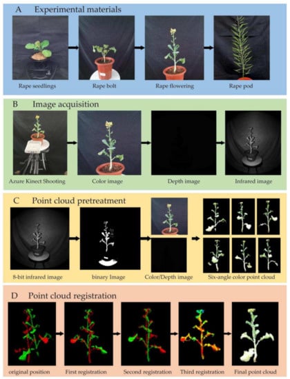 Taking rapeseed at the first flowering stage as an example, Figure 2 shows the algorithm flow of this manuscript. The color, depth, and near-infrared images of the plant at six viewing angles were acquired. We performed operations such as color-depth image alignment and point cloud smoothing on the image of each view, and then converted it into a color point cloud of a single view. The six color point clouds were merged into a integral point cloud by using the improved ICP iterative registration method, the point cloud filtering was performed again, and finally a high-precision color point cloud was obtained.