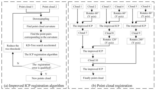 Flow chart of the point cloud registration. (a) Improved ICP registration algorithm. (b) Point cloud registration of six views.