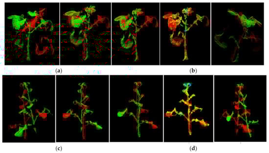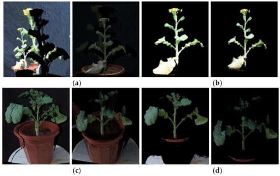 Figure 5 shows the processing results of a set of rape moss images. Figure 5a is the result of using the official SDK to align the flowering rapeseed and converting it into a point cloud and pass-through filtering to eliminate the background. Figure 5b is the alignment result and point cloud obtained by the proposed method. The alignment results and the point cloud in the comparison images Figure 5a and b have no ghosting. Figure 5c,d are the same type of test results of rape moss. We can find that for rape plants of different growth periods, the suggested methods can remove the ghost images in the alignment image, and also remove the noise of the point cloud.
