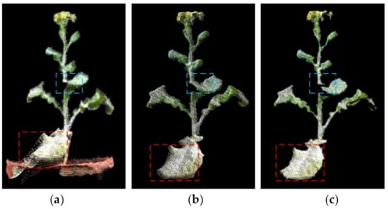 On this basis, the influence of shooting distance on 3D reconstruction was further explored. The best imaging distance within the imaging range (0.25–2.21 m) of Azure Kinect was tested with the black curtain indoors as the background. In the range of 0.25–1.5 m, RGB-D sequence images were taken every 0.25 m, the images were processed by the method in this paper, and the experimental results were compared and analyzed. The branch point cloud of rape was obtained at these six distances. As a result, by adapting our method as shown in Figure 7, we can find that when the shooting distance is greater than 0.5 m, the point cloud quality decreases significantly. The point cloud quality is the best when the shooting distance is 0.25 m, but a complete image cannot be obtained for objects with larger sizes at this distance. Therefore, the proper shooting distance should be set between 0.25–0.5 m according to the size of the object.