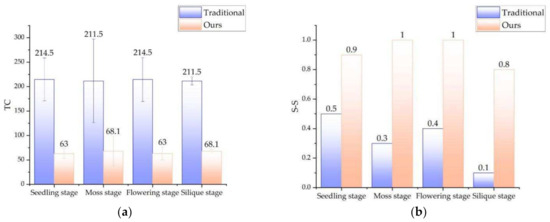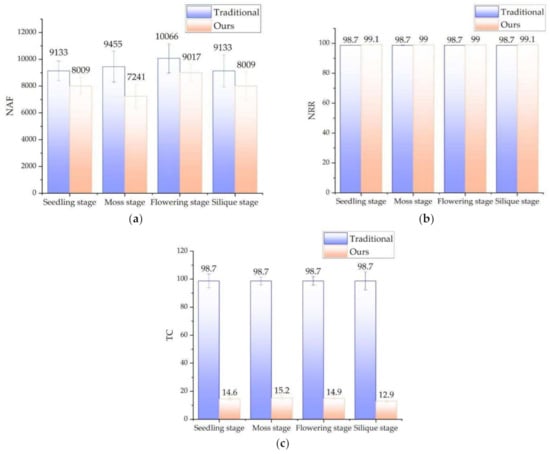 As shown in Figure 9, We tested the rape plants in four growth stages (seedling stage, moss stage, flowering stage and silique stage), with 10 samples in each stage. We counted NAF (the mean number of filtered point clouds), NRR (noise reduction ratio), and time-consumption. Figure 9a compares the performance of the two filtering methods. Compared with the traditional method, the suggested method is about 1378 points less than the traditional method in terms of the number of point clouds. The average NRR of the proposed method is 0.305% higher than that of the traditional method. This is reflected in the filtering effect, and the proposed method is more thorough in filtering noise. There is a significant difference between the two in terms of time-consumption, and the traditional method is 11.15 times that of the suggested method. The method in this paper benefits from the noise filtering before the point cloud conversion. The two-dimensional image processing saves a lot more time than the three-dimensional point cloud processing, which reflects the time-consuming. In addition, the speed of pass-through filtering depends on the number of point clouds. The number of point clouds involved in pass-through filtering in this method is significantly less than that of traditional methods, which in turn promotes further reduction in time-consuming. In general, the method in this paper can eliminate point cloud noise very well, and has significant advantages in terms of time-consumption.
