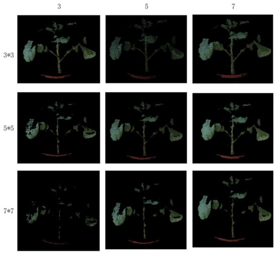 The optimal filtering method needs to set an appropriate neighborhood size and threshold. The size of the neighborhood is too small to judge the sudden change of the depth information, which leads to the deletion of too many valid points. However, too many points will participate in the judgment if the setting is too large, so that the deep mutation information is inaccurate and the mutation point cannot be found. Through the statistics of the gentle point cloud of a certain part of rape, it is found that the maximum depth difference in the local neighborhood is not obvious, and the difference is basically 5 points. This paper compares the size of different neighborhoods and the size of the threshold to eliminate the effect of floating point noise, and selects the final parameters. Figure 10 shows the filtering results of different parameters, the neighborhood sizes are 3 × 3, 5 × 5, and 7 × 7, and the thresholds range from 3, 5 to 7. Through comparison, it is found that when the neighborhood size is 3 × 3 and the threshold is 5. The effect of removing the noise point cloud is the best.