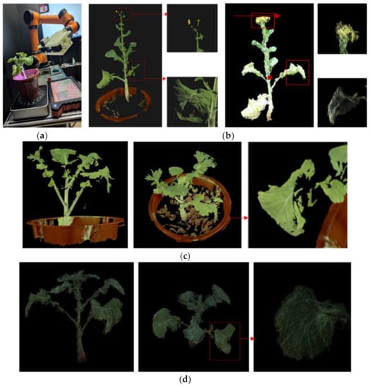 The point cloud obtained by the laser scanner is extremely accurate, and has become a benchmark reference for comparison experiments in 3D reconstruction. The laser scanner used in this manuscript was a WibooxPSC-TAAJ011A15 produced by Xianlin 3D Technology Co., Ltd. The scanner and the color camera were fixed to the robot arm (model AUBO ROBOTS) together, and the data of 6 angles of view of the rape plant were taken for 3D reconstruction [31]. The color 3D point cloud obtained was compared with the method in this paper. Figure 13a shows the working site and reconstruction results of the color laser scanner. As can be seen from the details marked in the figure, in terms of spatial resolution and color reduction, the laser scanner surpasses the method in this paper, and the point cloud of the stem part exceeds the method in this paper, but the point cloud of the leaf and flower part where the curvature changes greatly exceeds that of the laser scanner. The overall reconstruction effect of the laser scanner is better, especially the continuous and smooth parts of the reconstruction quality are excellent. However, the effect is not good for the parts with sudden curvature changes such as leaves and stems, and the point cloud is prone to defects and holes. In the partial enlarged images, only a small part of the point cloud is recovered from rape blossoms, which are almost impossible to reconstruct. Figure 11b shows the reconstruction results of this method for the same rapeseed plant. In all parts of the rape plant, it can be rebuilt very well with very few holes. Figure 13c,d are the contrast effects of rapeseed in the moss stage. It can be clearly observed that the leaves reconstructed by the three-dimensional scanner have a lot of authenticity, and the suggested method obtains a complete leaf point cloud. In general, the laser scanner can obtain more precise details, and the suggested method can obtain a more integral point cloud. At the same time, the method proposed in this manuscript is worse than the 3D laser scanner in terms of visual effects. This is mainly due to the weaker performance of the RGB camera used by Azure Kinect, which leads to insufficient color reproduction.