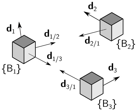 In the formation, the main constraint is that two of the vehicles, called the deputies, cannot measure LOS vectors between them. Meaning, for example, that these two vehicles are too far from each other. Furthermore, each vehicle can measure one inertial vector independently. The vehicle that measures LOS to the other two is identified as vehicle 1 and is denominated as chief, whereas the deputies are identified as vehicles 2 and 3. The subgroup with the chief and a deputy is called a branch of the formation, hence there are two branches in this case. The branch 1–2 includes the chief and vehicle 2, whereas branch 1–3 includes the chief and vehicle 3. The geometry of the framework is represented in Figure 1.