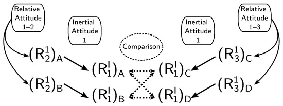 Consider the relative attitude between vehicles 1 and 2, i.e., . Recall the measurements given as , , , and . Then: