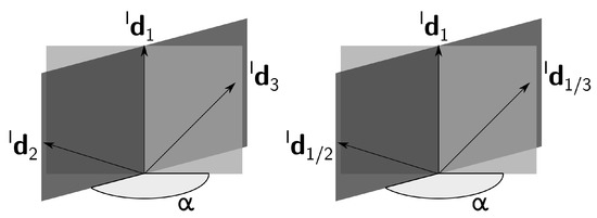 Then, from and substituting (A23) into (12) yields (A20a) and (A20b). Next, consider the converse statement, i.e., that both (A20a) and (A20b) are verified. Let , then if and only if , , and are coplanar or any of these vectors is zero. Then, and can be expressed as and , respectively with , , , and . Consider that , which means that (A21) is verified, then both and because . Otherwise, consider that , which means that and are orthogonal. Since verifying both and implies that , , and are coplanar, while , , and are coplanar, then and must be collinear because and are orthogonal. Therefore, in this case, (A23) is verified which was previously shown to be equivalent to (A22) and thus concludes the proof. □