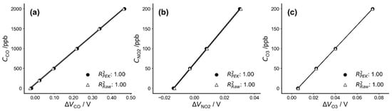 Correlation coefficients of baseline-corrected output as a function of raw sensor output for (a) CO, (b) NO2 and (c) O3 under controlled laboratory conditions (T = 22 °C, RH = 55%).
