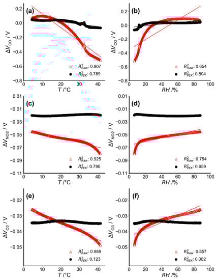 Multi-linear regression models are commonly used in sensor adjustment algorithms. Previous researchers [14,25,26] have employed them to compensate for environmental factors, typically representing pollutant concentration (c) as: