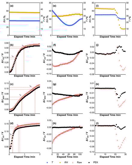 Note: The elapsed time refers to the time period counted from the beginning of the experiment and the zero-point shown in the x-axis refers to the experiment starting point. The experiment in Figure 4i–l had air temperature varying in a narrow range between 25 °C and 30 °C, due to the limitation of the environmental-controlled chamber, and it was difficult to maintain constant temperature when humidity had a rapid change but the temperature range was relatively narrow.
