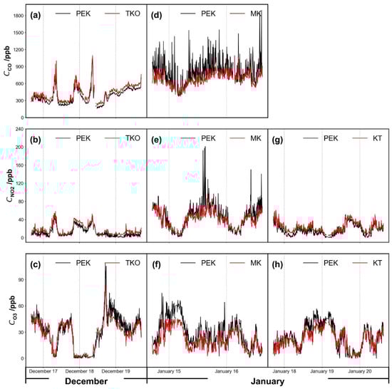 Time series plots for gases measured by the Personal Exposure Kit (PEK), calibrated under laboratory conditions (Methodology 2.3.1 (I)) as validated at the (a–c) Tseung Kwan O (TKO), (d–f) Mong Kok (MK) and (g,h) Kwun Tong (KT) air quality monitoring sites. Note: CO for Kwun Tong site was not available. Data resolution is set as 5 min.