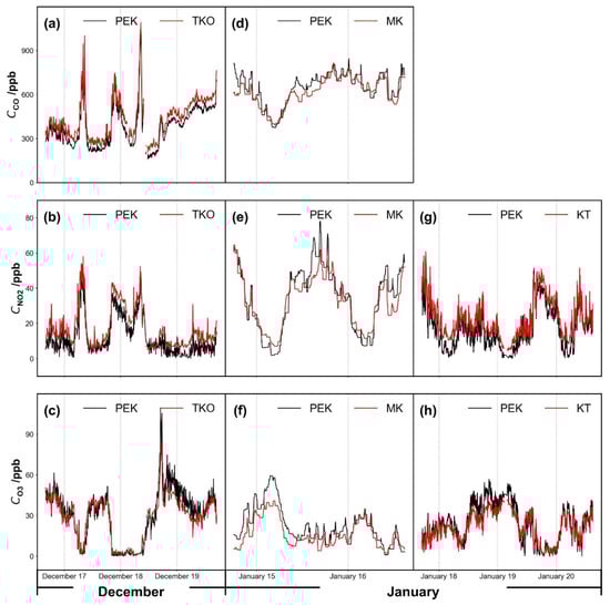 Pollutant concentrations corresponding to Figure 5: (a–c) Tseung Kwan O (TKO), (d–f) Mong Kok (MK) and (g,h) Kwun Tong (KT) air quality monitoring sites, except for Mong Kok (MK, d–f) which is corrected using the spline minimum method. Data resolution is set as 5 min.