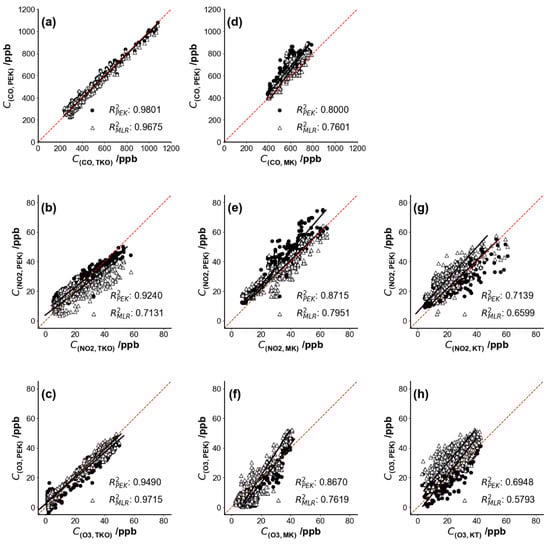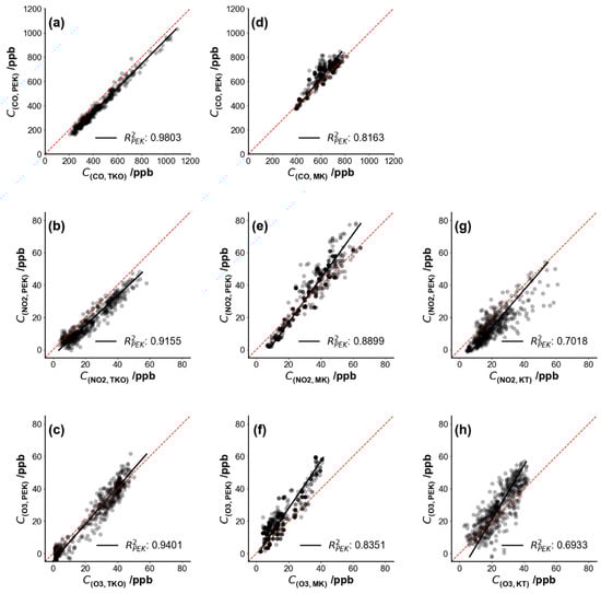Scatter plots of gases measured by the Personal Exposure Kit (PEK) under laboratory calibration condition (Methodology 2.3.1 (I)) against concentration values collected by fixed monitors at the reference sites. Each sub-figure corresponds to the time series plots shown in Figure 6: (a–c) Tseung Kwan O (TKO), (d–f) Mong Kok (MK) and (g,h) Kwun Tong (KT) air quality monitoring sites. The dashed red line represents the identity line. Data resolution is set as 5 min.