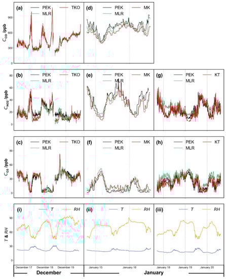 Time series plots of gases across the test period tuned via the multi-linear regression model compared with Personal Exposure Kit (PEK) measurements, which were calibrated following Protocol 2 at the Tseung Kwan O (TKO) site (a–c), at Mong Kok (MK) (d–f) and Kwun Tong (KT) (g,h) air quality monitoring sites under the same ambient conditions, including environmental factors, temperature (15 °C–30 °C) and humidity (45–90%) (i–iii). Data resolution is set as 5 min.