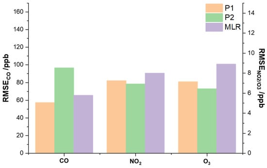 RMSE determined from respective calibration protocols along with the conventional multi-linear regression model: Protocol 1 (P1) refers to the Personal Exposure Kit (PEK) calibrated with standard gases under laboratory conditions; Protocol 2 (P2) refers to the PEK calibrated by collocation with government reference instruments and Method 1 (MLR) refers to raw sensor signal tuned by the multi-linear regression in the same circumstances.