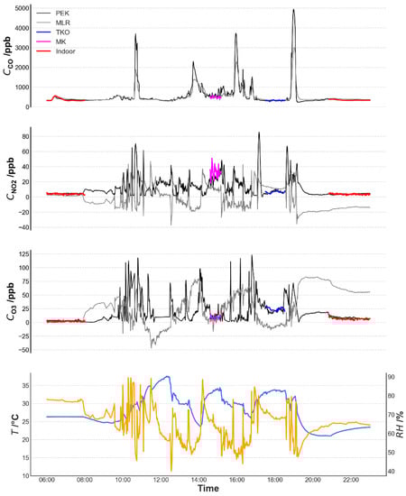 The kit was trialed as a personal exposure monitor across a range of urban microenvironments. It was carried on a backpack into various indoor and outdoor locations, which represent notable variations in pollutant concentrations. Figure 11 shows that the kit can capture short-period pollutant fluctuations even though temperature and humidity vary between the range of microenvironments. Corrections using the multi-linear regression model were not applicable to such unstable environments, especially for NO2 and O3 measurements. There is no obvious difference between the PEK measurements and the multi-linear regression model under the initial indoor conditions. However, the influence of environmental factors is problematic in output corrected using the multi-linear regression model. When the kit was taken back to the identical indoor conditions, both NO2 and O3 algorithms continued to fail.