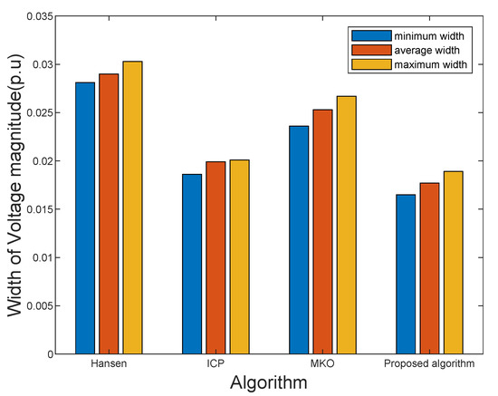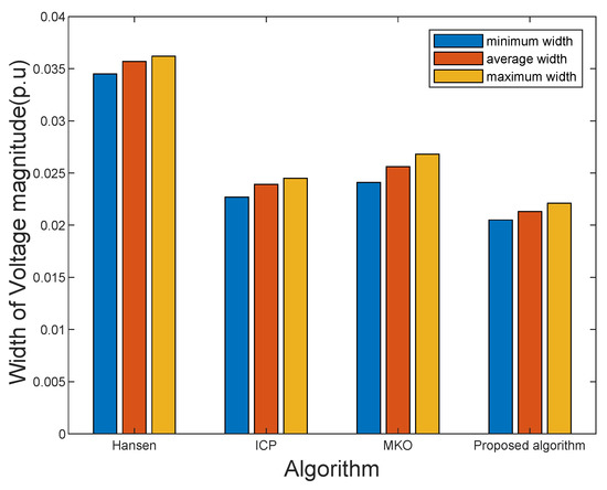 In this subsection, the average width of the voltage magnitude , the minimum width of the voltage magnitude and the maximum width of the voltage magnitude are utilized to measure the quality of the state estimation results according to [8,25]