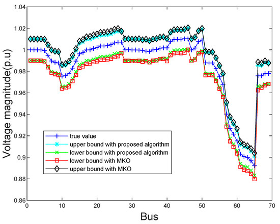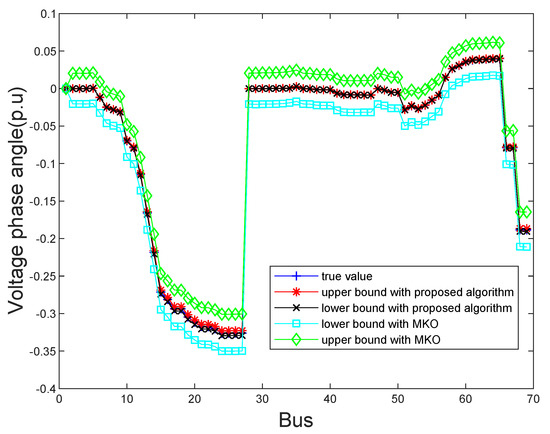 In order to show the exact state estimation results obtained by the proposed algorithm and the MKO algorithm more intuitively, the estimated bus voltage magnitudes and phase angles on IEEE 69-bus system are shown in Figure 5 and Figure 6. It is clear that the upper and lower bounds of the state estimation results of two algorithms can contain true values. However, the proposed algorithm can obtain more tighter bounds of state estimation results than the MKO approach. Even though a variety of uncertainties occur, our proposed algorithm can still make the state estimation results within the normal operating range and that demonstrates that our proposed algorithm is reliable.