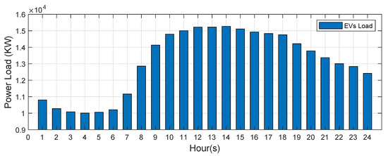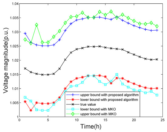 In order to study the influence of the uncertainty of EV charging load to the ISE, this paper uses the Monte Carlo sampling method based on statistical data laws and interval numbers to predict the EV charging load demand according to [28]. Figure 8 shows the load changes of electric vehicles in one day. In order to show the state estimation results obtained by the proposed algorithm and the MKO algorithm more intuitively, the state estimation results obtained by the two algorithms are compared on the IEEE 69-bus system. This IEEE 69-bus system connects electric vehicles at bus 69 and record the state estimation results change at bus 68. The state estimation results at bus 68 obtained through the proposed algorithm and MKO algorithm are shown in Figure 9. The proposed algorithm can obtain tighter bounds of estimation results than the MKO. In addition, the obtained by the proposed algorithm is still better than MKO, as given in Table 1. This verifies the proposed algorithm can effectively alleviate the conservatism of the uncertain state estimation solution, eliminating the interval state estimation of actual calculation cannot exist.