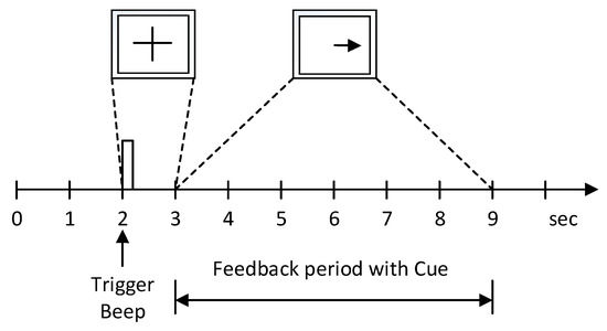 The second dataset used in this paper is BCI Competition II dataset III [16]. The dataset was recorded from a female subject. The dataset was recorded at 128 Hz sampling frequency. It was band-pass filtered between 0.5 Hz and 30 Hz. The experiment included 280 trials of 9 s length. This is illustrated in Figure 2. Each trial starts with a fixed cross and an additional short audible warning tone. After a few seconds, a visual cue appeared, and the subject had to visualize the corresponding hand movements within 6 s.