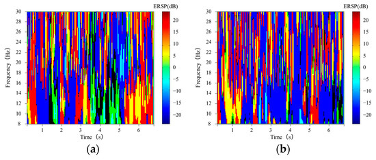 Final combined time-frequency images of left-hand (a) and right-hand (b) motor imagery. It can be seen that the energy difference between the two time-frequency images is obvious 4 s after the trail begins.