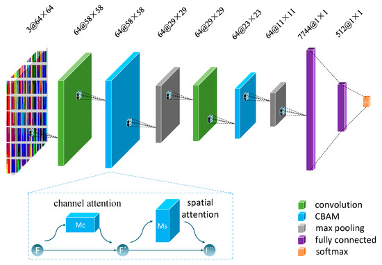 In IS-CBAM-CNN, the CBAM is embedded in the middle of the convolutional and pooling layers. The CBAM module includes two parts. The first part is the channel attention map , which enables the selection of channels. The other part is the spatial attention map , which selects the areas of the image space that require attention. C, H, and W are the indicators of the number of channels, height, and width of the feature map, respectively. As shown in Figure 5, the feature map output from the convolution layer passes through a channel attention module. The output is weighted and fed into a spatial attention module. The final weighting is done to get the result to be passed to the pooling layer. The overall attention process can be summarized as shown in Equations (4) and (5):
