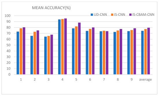Comparison of the accuracy results of UD-CNN, IS-CNN, and IS-CBAM-CNN.