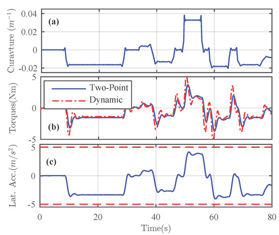 The performance of the proposed human-machine shared controller has been evaluated for lane keeping under different road friction conditions and parametric uncertainties. The simulated dynamic test track is with various varying curvatures as depicted in Figure 2a. To simulate the behaviors of the human driver, the two-point driver model in Reference [25] has been employed in the simulations. The driver torque issued from this model, i.e., the virtual driver toque used to represent a human driver, can be given as a linear combination of the driver’s anticipatory and compensatory actions for a specified look-ahead distance. By varying the anticipatory and compensatory gains, i.e., and , respectively, the characteristics of various drivers can be replicated. Note that the response of the two-point driver model [25] is not exactly similar to the driver model (5) used for the shared control design. For illustrations, we present the comparison of torques generated by both the driver models with the same anticipatory and compensatory gains in Figure 2b.