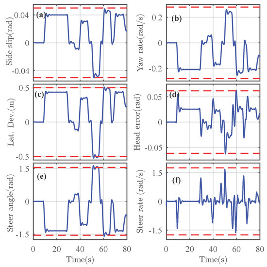 We can see that the controlled states are constrained within a safe vehicle operating condition. The lane keeping performance is also guaranteed by the low magnitude of the tracking errors and . The maximum and RMS values of these errors are, respectively, given by [m], [rad], and [m], [rad]. These results confirm that the controlled vehicle is maintained around the lane center. Similarly, the maximum and RMS values of the steering rate are, respectively, obtained as = [rad/s] and [rad/s], which shows a good driver comfort level while completing the driving task. The vehicle stability is also guaranteed with small computed indexes for the yaw rate are = [rad/s] and = [rad/s]. Observe that even during sharp curves of radius 25 [m], the maximum values of the yaw rate and the steer-rate do not increase beyond their respective maximal levels [rad/s] and [rad/s], which also indicates a good control performance.