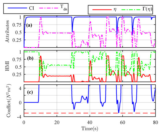 (a) Cooperative index and normalized driver torque. (b) Driver performance and provided level of haptic authority. (c) Conflict between the human driver and the automation represented by Conflict .