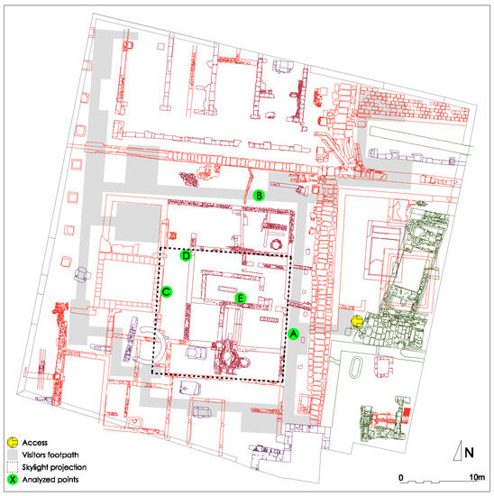 - Reworked from Ground Plan of the Museum. Available online: https://www.esturismo.eu/Europa/Espana/Valencia/Centro_Arqueologico_de_la_Almoina.html (accessed on 29 July 2020).