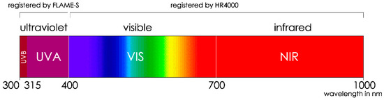 As the UVB radiation values below 300 nm with FLAME-S had a lot of background noise, they were discarded from the calculations. Wavelengths above 1000 nm were also disregarded for the same reason, meaning that the total range covered was from 300 to 1000 nm. This range was organized into UVB, UVA, VIS and NIR bands, according to their physical properties and their environmental effects (Figure 4).