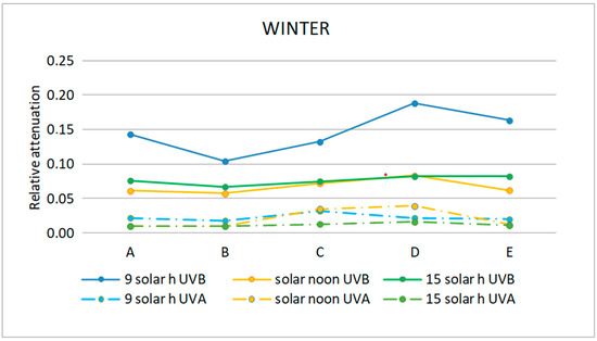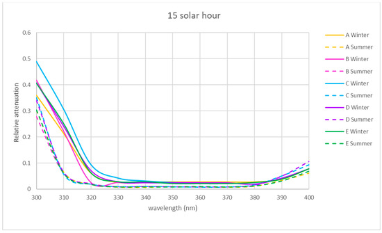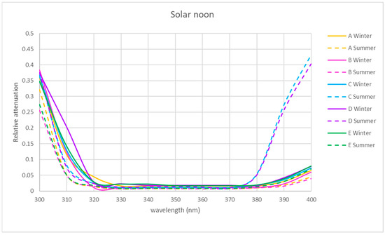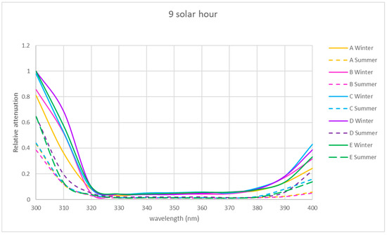 In the two seasons of the year studied, the shape of the relative attenuation curve is similar for all the locations studied, as it can be seen in Figure 5, Figure 6 and Figure 7. The curves present a maximum at 300 nm, decrease to 320 nm, remain negligible up to 370 nm and slightly increase in the morning and afternoon, with a greater increase at midday in summer for interior locations C and D, reaching a relative attenuation of 45%.
