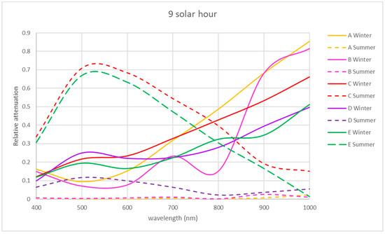 The spectral relative attenuation of the UV band was calculated according to Equation (2) for the chosen sites and two seasons of the year and is represented graphically in Figure 5, Figure 6 and Figure 7 for the three times of the day studied: 9 a.m. (morning), 12 p.m. solar (noon) and 15 p.m. (afternoon).
