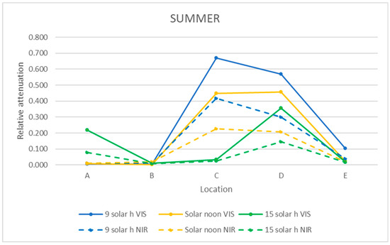 Representation of the mean relative attenuation for the VIS and NIR ranges for the 5 locations studied in summer at 3 times of day.