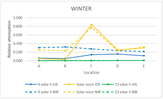 Analyzing Figure 8, Figure 9 and Figure 10 of the VIS and NIR bands, a great variability is observed, although analyzing Figure 13, where the mean attenuations for both bands are represented, a higher relative attenuation is also observed in the early morning. On the other hand, in winter (Figure 14), the same behavior does not occur.