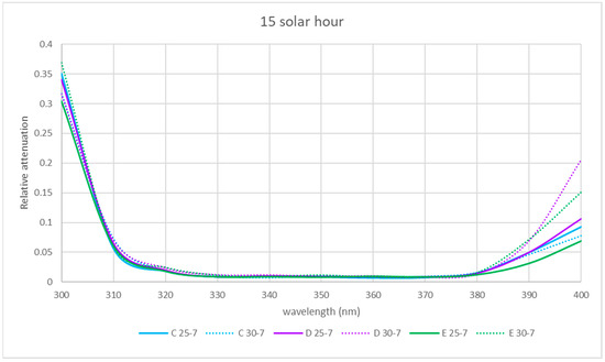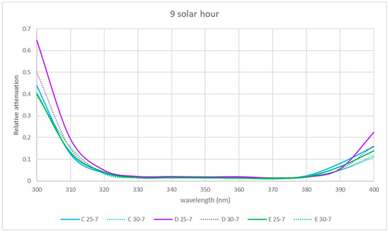In summer, the general trend was also similar in all locations. At 300 nm, the relative attenuation was also at its maximum in the morning, around 60% in location D and about 40–45% at the rest of the locations (Figure 5), ranging in the afternoon between 35 and 40% (locations C and D) and 25 and 30% (rest of locations) (Figure 6 and Figure 7), and it was at its minimum at noon (25 to 35%) for all locations.