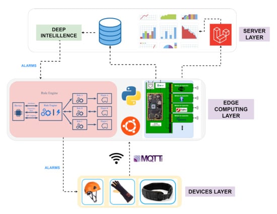Currently, companies in the industrial sector focus their efforts on incorporating the advances included in the Industry 4.0 model to continue competing in an increasingly high-tech market. This proposal includes the development of a control and visualisation platform that integrates hybrid artificial intelligence algorithms to detect and prevent risks and accidents. As part of the development, different devices have also been developed that are connected to the platform for identifying risk situations so that the worker can be notified. The proposed system [] is based on an architecture where there is a concentrator node consisting of a NVIDIA Jetson Nano, which is responsible for collecting the measurements received by the different devices in JSON format. Through communication with the Mosquitto server with MQTT communication protocol, the data will be sent to the remote server, reducing the sending rate to the essential data, thus deploying an edge computing system. The devices that have been developed are a helmet, belt and bracelet, which can be integrated into the platform to carry out the data analysis. As the data logger, we ideally use a NVIDIA Jetson Nano as an IoT edge device because it is a powerful low-power board, which allows carrying out intensive computations of algorithms based on machine learning. The described system can be seen in the following Figure 1 where there are three distinct layers. In the lower layer of devices, data collection and detection of individual alarms is carried out separately for each device. Subsequently, it communicates via WiFi with the intermediate layer in which data are collected from each one. In this layer, edge computing technology is used; all the system information is processed, applying intelligent algorithms to this layer for the early detection of anomalies and pre-processing the data before being sent to the Cloud in an orderly manner. Finally, the information is received in a Cloud environment for the visualisation of the data from the platform and the application of deep learning models to detect possible anomalies thanks to the training of the set of data ingested historically.